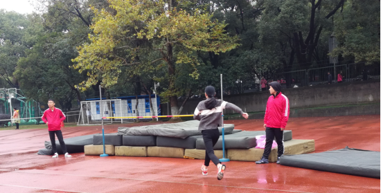 在个人赛事中,经管中心的运动健儿参加了跳高项目。天空飘着蒙蒙细雨,但是运动员们个个精神抖擞,在一段助力跑之后,撑杆纵身腾空一跃,在空中形成一条弧线。